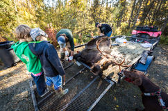 Three families get together to skin and butcher a young bull moose. Altogether, 7 kids are present. It’s a typical Sunday during Fall in Alaska.